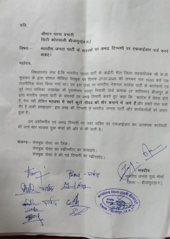 कांग्रेस नेता एवं पूर्व नगर पालिका उपाध्यक्ष पुरषोत्तम सल्लूर द्वारा सोशल मीडिया प्लेटफॉर्म फेसबुक पोस्ट पर भाजपाइयों की गई इस अभद्र, अशोभनीय टिप्पणी के विरोध में भाजपा युवा मोर्चा ने बीजापुर कोतवाली पहुंचकर कांग्रेस नेता के खिलाफ एफआईआर दर्ज करवाई। भाजपा युवा मोर्चा के नेताओं ने पुलिस प्रशासन से मामले की जांच कर उचित कार्रवाई की मांग की है। तीन दिवस के भीतर कार्रवाई न होने की स्थिति में बीजापुर कोतवाली का घेराव की चेतावनी दी गई है। इस दौरान युवा मोर्चा प्रदेश कार्यसमिति सदस्य फूलचंद गागड़ा, जिला पंचायत सदस्य मैथ्यूज कुजूर, पूर्व युवा मोर्चा महामंत्री गौतम राव, पार्षद अरविंद पुजारी, आईटी सेल सह संयोजक केजी सुधाकर, युवा मोर्चा मंडल अध्यक्ष मिथलेश नाग, मंडल उपाध्यक्ष संदीप तेलम, मंडल महामंत्री दीपक भट्ट, पार्षद संजय रिवानी, पार्षद हितेश साहनी, पार्षद मुकेश राठी, पार्षद विक्रम दूधी, पुरषोत्तम भंडारी, जितेंद्र तेलम, गनपत धुर्वा उपस्थित रहे।
