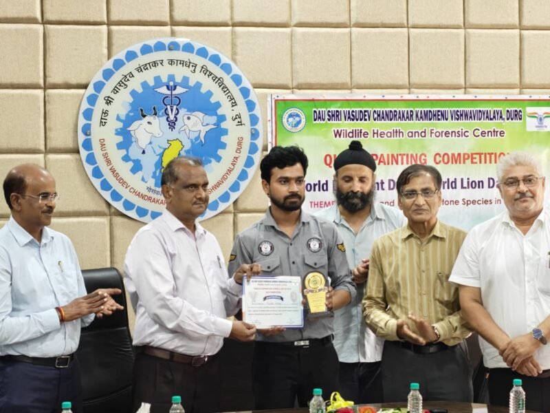 दुर्ग । दाऊ वासुदेव चंद्राकर कामधेनु विश्वविद्यालय, दुर्ग में कुलपति डॉ.आर.आर.बी.सिंह के मार्गदर्शन एवं डॉ.जी.के.दत्ता, निदेशक, वन्यप्राणी एवं फॉरेंसिक सेंटर के नेतृत्व में अधिष्ठाता डॉ.संजय शाक्य, अधिष्ठाता छात्र कल्याण डॉ.मंजू रॉय, वरिष्ठ प्राध्यापक डॉ.राजू शारदा, विश्वविद्यालय जनसंपर्क अधिकारी डॉ.दिलीप चौधरी, डॉ.सुभाष वर्मा, कुलपति जी के निज सहायक संजीव जैन की गरिमामयी उपस्थिति में वन्यजीव एवं फॉरेंसिक सेंटर द्वारा विश्व हाथी एवं विश्व सिंह दिवस के अवसर पर “ट्रम्पेट एण्ड रोअर्सः कीस्टोन स्पीसिज़ इन एक्शन“ थीम पर पशुचिकित्सा एवं पशुपालन महाविद्यालय, अंजोरा में अध्ययनरत छात्र-छात्राओं हेतु पेंटिग एवं प्रश्नोत्तरी प्रतियोगिता का आयोजन किया गया।