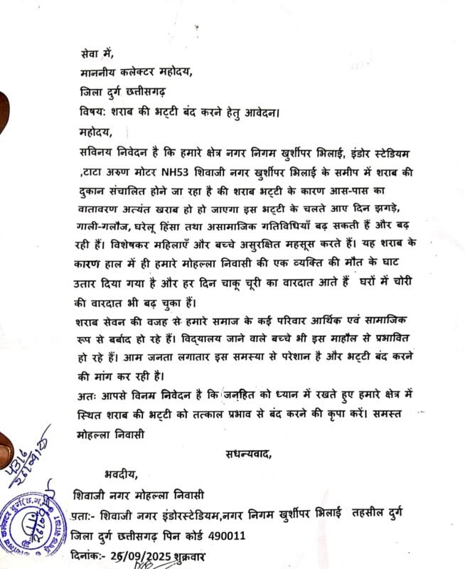 जहाँ सरकारी अस्पताल, आंगनवाड़ी केंद्र और अटल आवास कॉलोनी है।श्री जसप्रीत सिंह ने दो टूक शब्दों में कहा, “हम साफ कहते हैं कि चाहे बीजेपी हो या कांग्रेस, जो भी शराब माफिया के साथ खड़ा रहेगा, जनता उन्हें सबक सिखाएगी। आम आदमी पार्टी खुर्सीपार की माताओं और बहनों के साथ है। हम यह ठेका किसी भी कीमत पर नहीं खुलने देंगे।”अंतिम चेतावनी और आंदोलन की रणनीति समस्त मोहल्ला वासियों ने श्री सिंह के साथ मिलकर संकल्प लिया है कि यदि प्रशासन ने तत्काल शराब ठेके के निरस्त नहीं किया, तो: प्रस्तावित शराब दुकान के सामने अनिश्चितकालीन धरना प्रदर्शन शुरू किया जाएगा।