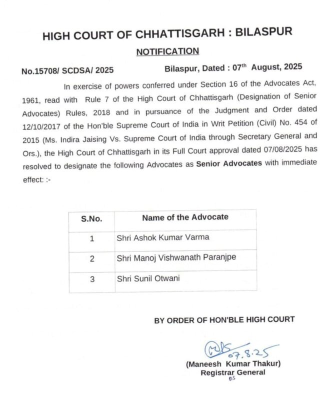 रजिस्ट्रार जनरल मनीष कुमार ठाकुर द्वारा दिनांक 07/08/2025 को जारी अधिसूचना क्रमांक 15708/एससीडीएसए/2025 के अनुसार, अशोक कुमार वर्मा, मनोज विष्णनाथ परांजपे और सुनील ओटवानी को वरिष्ठ अधिवक्ता के रूप में नामित किया गया है। यह नियुक्ति तत्काल प्रभाव से लागू मानी गई है।