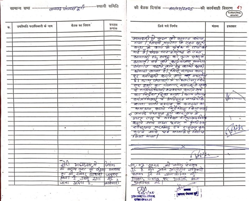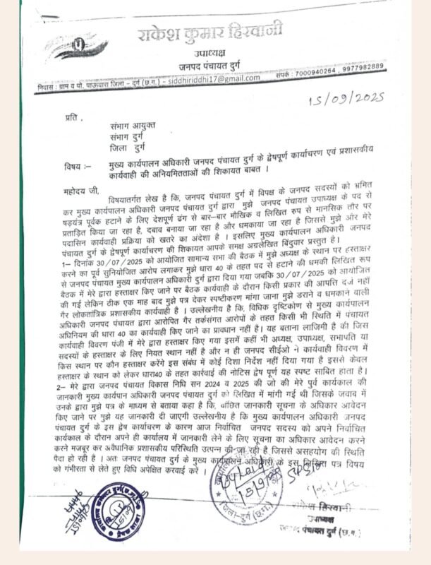 इसके बाद से राजनीतिक माहौल इतना गरमाया हुआ है कि जनपद उपाध्यक्ष हिरवानी भी सकते में आ गए है। अब सवाल उठने लगा है कि क्या अब उन्हें पद से हटा दिया जाएगा। प्रदेश में भाजपा की सरकार है और भाजपा की है जनपद अध्यक्ष है। आप को बता दें कि 30 जुलाई 2025 को जनपद में सामान्य सभा की बैठक हुई थी। बैठक् में अध्यक्ष खुद मौजूद थी और एजेंडे पर चर्चा की गई। अंत में उपाध्यक्ष हिरवानी अपनी अध्यक्ष की जगह पर खुद ही कटमट करके साइन कर दिया है।वहीं हिरवानी का आरोप है कि 30/07/2025 को आयोजित सामान्य सभा की बैठक में मुझे अध्यक्ष के स्थान पर हस्ताक्षर करने का पूर्व सुनियोजित आरोप लगाकर मुझे धारा 40 के तहत पद से हटाने की धमकी लिखित रूप से जनपद पंचायत मुख्य कार्यपालन अधिकारी दुर्ग द्वारा दिया गया। जबकि बैठक में मेरे हस्ताक्षर किए जाने पर बैठक कार्यवाही के दौरान किसी प्रकार की आपत्ति दर्ज नहीं की गई, लेकिन अब एक माह बाद मुझे पत्र देकर स्पष्टीकरण मांगा जा रहा है।