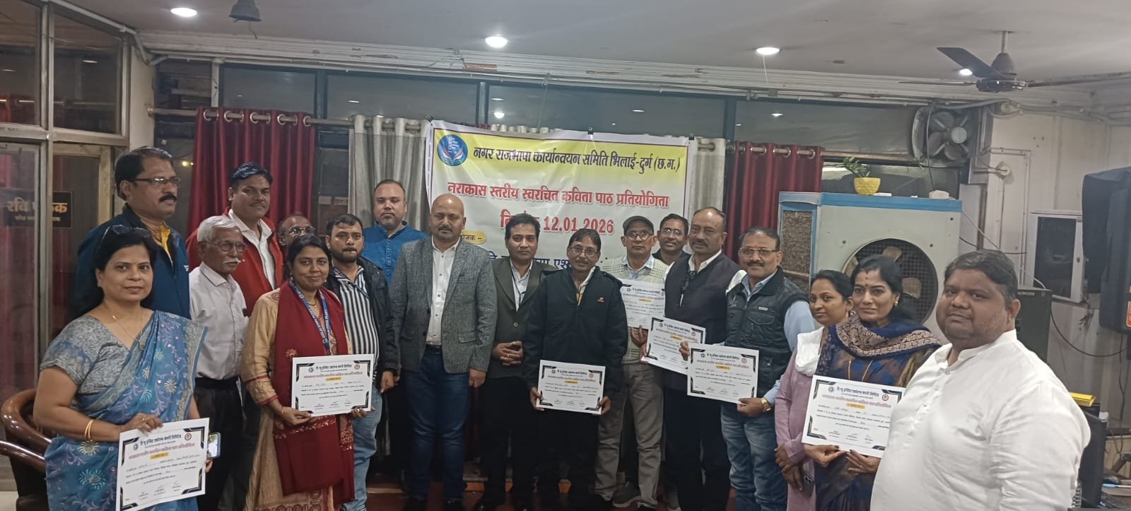 भिलाई। दि न्यू इंडिया एश्योरेंस कंपनी लिमिटेड, माध्यम व्यवसाय कार्यालय भिलाई द्वारा नराकास भिलाई- दुर्ग के तत्वावधान में दिनांक 12 जनवरी 2026, सोमवार को नराकास स्तरीय स्वरचित काव्य पाठ प्रतियोगिता का सफल एवं भव्य आयोजन किया गया। कार्यक्रम के मुख्य अतिथि राजीव कुमार, सचिव नराकास भिलाई–दुर्ग रहे तथा अध्यक्षता रवि पाठक, वरिष्ठ मंडल प्रबंधक, न्यू इंडिया एश्योरेंस कंपनी लिमिटेड, भिलाई ने की। अपने अध्यक्षीय उद्बोधन में रवि पाठक ने कहा कि हिंदी हमारी सांस्कृतिक चेतना की आत्मा है और ऐसे साहित्यिक आयोजनों से कार्यस्थल पर रचनात्मक वातावरण का निर्माण होता है। मुख्य अतिथि राजीव कुमार ने अपने वक्तव्य में कहा कि स्वरचित काव्य पाठ जैसी प्रतियोगिताएं भाषा के प्रति आत्मीयता बढ़ाती हैं और हिंदी को जन-जन से जोड़ने का कार्य करती हैं। प्रतियोगिता में भिलाई स्टील प्लांट के विभिन्न विभागों के कर्मचारियों सहित हिंदुस्तान प्राइवेट लिमिटेड, फूड कारपोरेशन ऑफ इंडिया, छत्तीसगढ़ स्टेट इलेक्ट्रिसिटी, आईआईटी भिलाई, यूनाइटेड इंडिया इंश्योरेंस, राष्ट्रीय सांख्यिकी विभाग दुर्ग सहित विभिन्न संस्थानों के कुल 25 प्रतिभागियों ने उत्साहपूर्वक भाग लिया। कार्यक्रम का कुशल संचालन अजिताभ कुमार, हिंदी अधिकारी, दि न्यू इंडिया एश्योरेंस कंपनी लिमिटेड, भिलाई द्वारा किया गया।