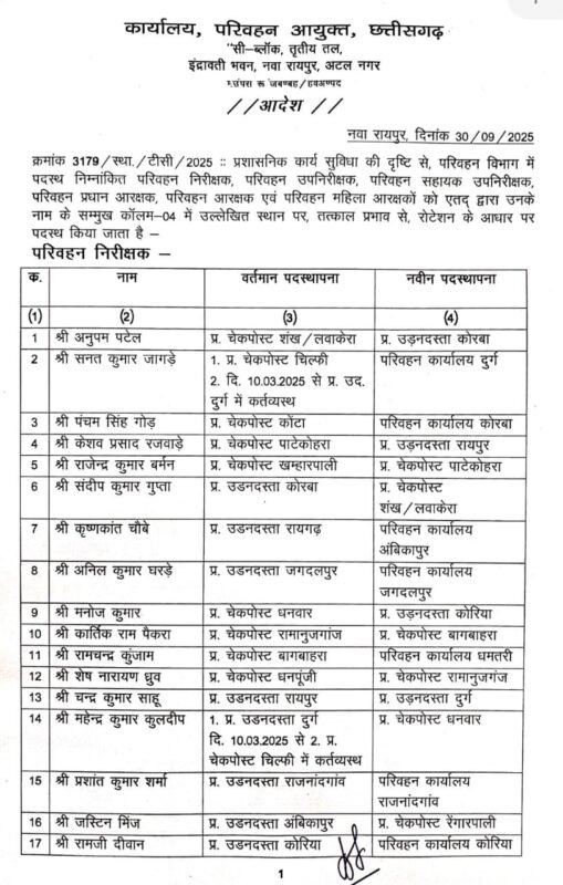 यह सभी परिवहन विभाग के सभी 16 चेकपोस्ट, 7 उड़नदस्ता और परिवहन विभाग कार्यालय में पदस्थ थे। इन सभी का रोटेशन के आधार पर तबादला किया गया है। साथ ही सभी को तत्काल नए स्थान पर पदभार ग्रहण करने के निर्देश दिए गए है।