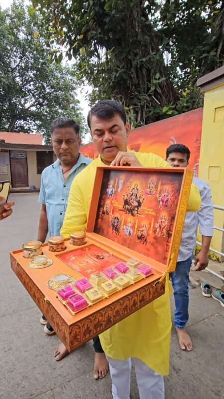जिसका निमंत्रण कार्ड छप कर तैयार हो गया है और पहला निमंत्रण कार्ड दया सिंह से सेक्टर 5 में विराजे भगवान गणेश जी को दिए। सुबह मंदिर पहुंच कर दया सिंह ने पहले पूरे विधि विधान के साथ गणेश जी की पूजा अर्चना की। श्रद्धा के पुष्प अर्पित किए। इसके बाद गणेश जी को निमंत्रण पत्र दिया। उन्होंने बताया कि हर साल नवरात्रि में खुर्सीपार में भव्य सेवा पंडाल बनाया जाता है। इस साल भी बनाया जा रहा है। जहां हजारों की संख्या में माता के भक्त आते है। पैदल माता बम्बलेश्वरी के दर्शन करने के लिए जाने वाले भक्तों के रूकने, विश्राम करने, भोजन, नाय-नाश्ता , फल, दूध आदि नि:शुल्क उपलब्ध कराया जाता है। सिर्फ यही नहीं यहां मेडिकल की टीम होती है, जो इलाज व दवा भी देती है।