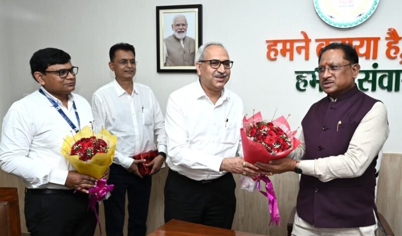 रायपुर। मुख्यमंत्री विष्णु देव साय से आज राजधानी रायपुर स्थित मुख्यमंत्री निवास कार्यालय में भिलाई स्टील प्लांट के नवनियुक्त निदेशक चित्त रंजन महापात्र ने सौजन्य मुलाकात की। इस अवसर पर महापात्र ने मुख्यमंत्री साय को पुष्पगुच्छ और स्मृति चिन्ह भेंट कर सम्मानित किया। मुख्यमंत्री ने महापात्र को उनकी नवीन पदस्थापना पर हार्दिक बधाई एवं शुभकामनाएँ दीं।