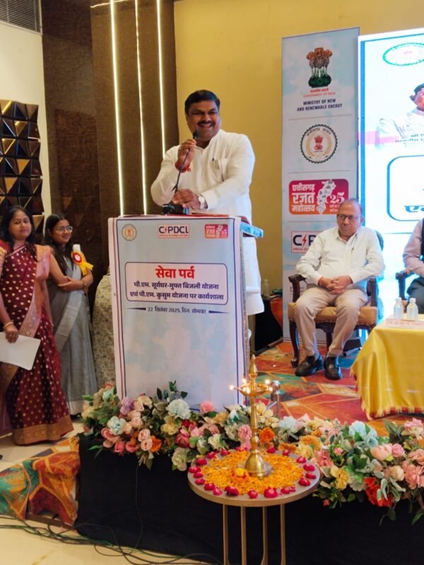 दुर्ग। राज्य शासन के निर्देशानुसार 17 सितम्बर से 02 अक्टूबर 2025 तक चलने वाले सेवा पखवाड़ा अभियान के दौरान छत्तीसगढ़ स्टेट पॉवर डिस्ट्रीब्यूशन कम्पनी लिमिटेड (सीएसपीडीसीएल) दुर्ग क्षेत्र द्वारा पीएम सूर्यघर मुफ्त बिजली योजना और पीएम-कुसुम योजना पर आज दुर्ग के वृन्दावन होटल में एक विस्तृत कार्यशाला का आयोजन किया गया। इस कार्यक्रम में मुख्य अतिथि के रूप में स्कूल शिक्षा मंत्री गजेन्द्र यादव शामिल हुए। कार्यशाला का मुख्य उद्देश्य आम नागरिकों और किसानों के बीच इन योजनाओं के बारे में जागरूकता बढ़ाना था, ताकि वे सौर उर्जा का लाभ उठाकर आत्मनिर्भर बन सके।