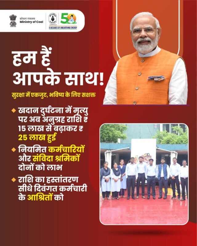 - कोल इंडिया की तरफ से 1 करोड़ का निःशुल्क दुर्घटना बीमा, 25 लाख रुपया की मुआवजा राशी