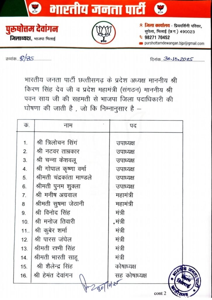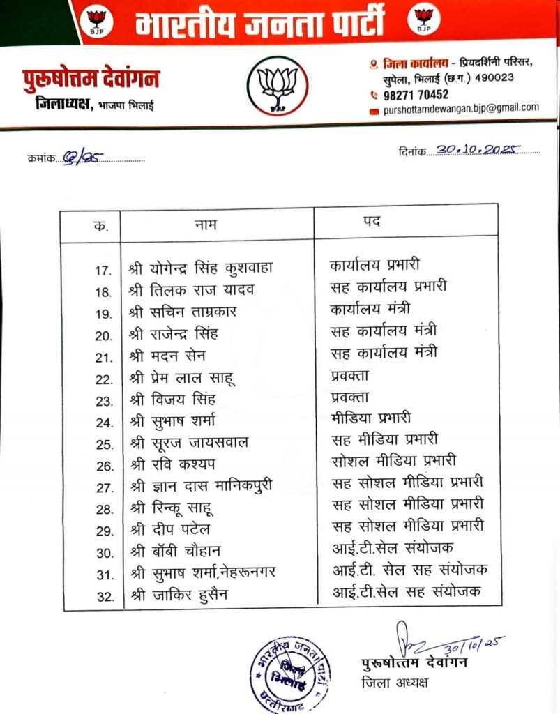 भिलाई। लंबे इंतजार और संगठन के भीतर करीब 10 महीने के गहन मंथन के बाद आखिरकार भिलाई जिला भाजपा की नई कार्यकारिणी की घोषणा कर दी गई।