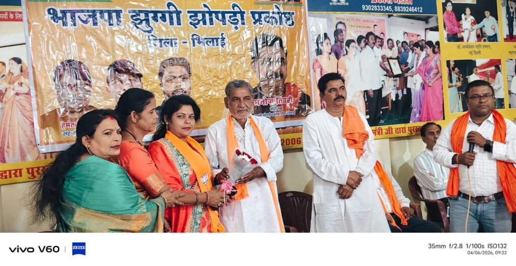 झुग्गी-झोपड़ी प्रकोष्ठ भिलाई के जिला संयोजक मनोज तिवारी ने स्वागत भाषण देते हुए जनसंघ से लेकर भाजपा के निर्माण तक की यात्रा पर प्रकाश डाला। उन्होंने अपने उद्बोधन में पार्टी की रीति-नीति, राष्ट्रवाद और अंत्योदय के सिद्धांतों को रेखांकित करते हुए कार्यकर्ताओं को सेवा एवं समर्पण के साथ कार्य करने के लिए प्रेरित किया।