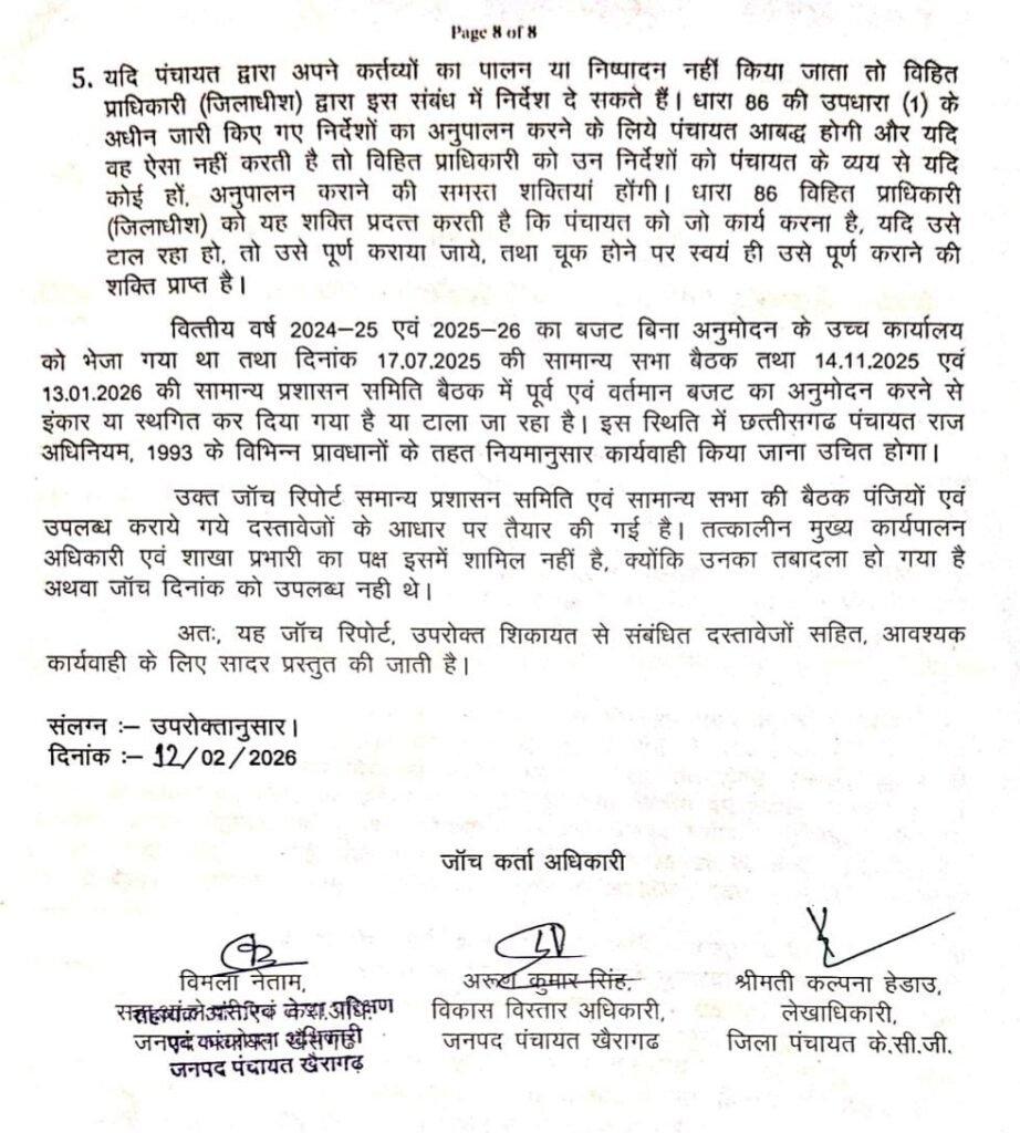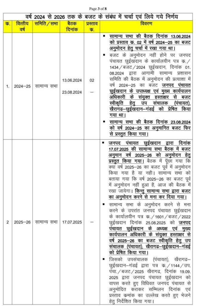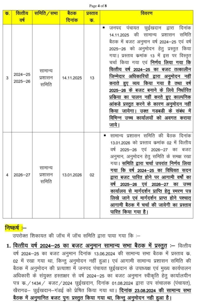 रिपोर्ट के अनुसार वर्ष 2024-25 और 2025-26 दोनों वित्तीय वर्षों के बजट अनुमान सामान्य प्रशासन समिति और सामान्य सभा में प्रस्तुत किए गए थे, लेकिन सदस्यों द्वारा अनुमोदन नहीं दिया गया।। इसके बावजूद जनपद पंचायत के अध्यक्ष और मुख्य कार्यपालन अधिकारी के संयुक्त हस्ताक्षर से बजट उच्च कार्यालय (उपसंचालक पंचायत) को स्वीकृति के लिए भेज दिया गया।।