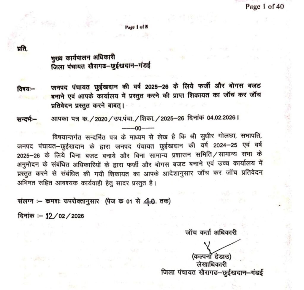 खैरागढ़ : जनपद पंचायत छुईखदान के वित्तीय वर्ष 2025-26 के कथित “फर्जी और बोगस बजट” को लेकर उठे विवाद में अब प्रशासनिक जांच पूरी हो गई है।।जिला पंचायत स्तर से गठित जांच दल ने अपनी रिपोर्ट सौंप दी है, जिसमें बिना अनुमोदन बजट भेजे जाने की पुष्टि तो हुई है, लेकिन इसे स्पष्ट रूप से फर्जी या मनगढ़ंत साबित नहीं माना गया।। जांच रिपोर्ट में इस पूरे प्रकरण को नियमों के विपरीत प्रक्रियात्मक त्रुटि बताया गया है।।