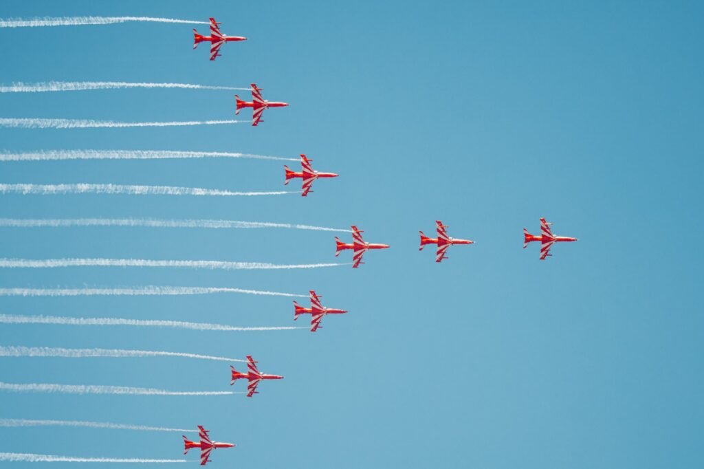 1996 में गठित सूर्यकिरण एरोबैटिक टीम भारतीय वायुसेना की सटीकता और सामूहिक समन्वय की अनूठी मिसाल है। एशिया की यह एकमात्र नौ विमान वाली एरोबैटिक डिस्प्ले टीम है, जिसके विमानों के बीच की दूरी मात्र पाँच मीटर तक होती है। यह भारत की तकनीकी दक्षता, अनुशासन और साहस का अद्भुत उदाहरण है।