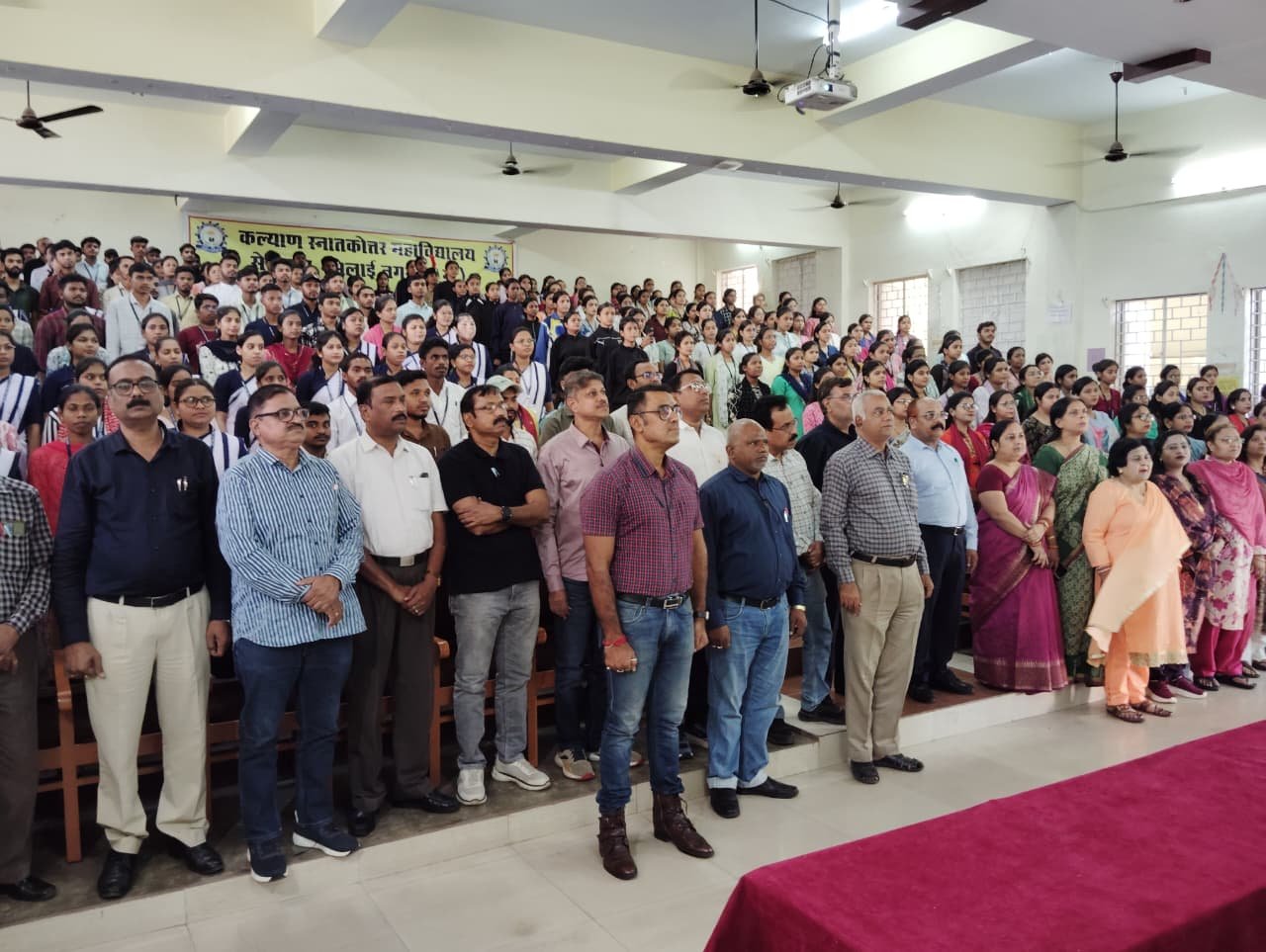 भिलाई। भिलाई के सेक्टर-7 स्थित कल्याण स्नातकोत्तर महाविद्यालय में देश के राष्ट्रीय गीत वंदे मातरम का गायन किया गया। महाविद्यालय के प्रमुख सभागार में आयोजित कार्यक्रम में सभी ने राष्ट्रीय गीत वंदे मातरम का सामूहिक गायन किया। तमाम संकायों के अध्यक्ष, विभिन्न विभागों के अध्यक्ष, प्राध्यापक, अधिकारी, कर्मचारी, विद्यार्थी, शोधार्थियों के द्वारा भारत की राष्ट्रीय गीत वंदे मातरम का सामूहिक गायन किया गया।