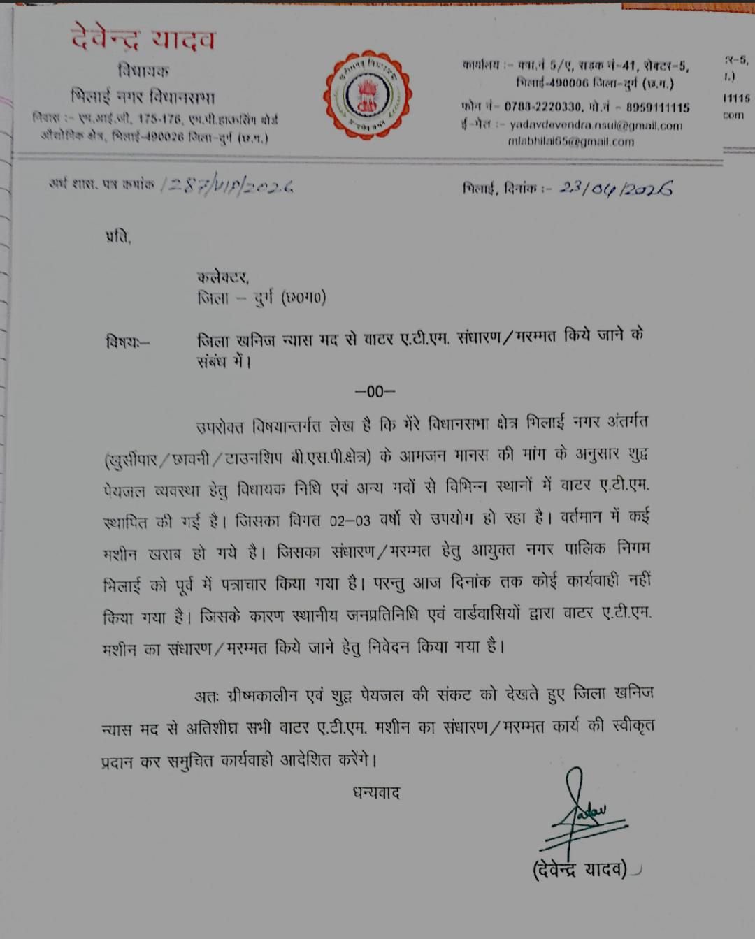 विधायक ने पत्र मे लिखा है कि भिलाई नगर विधानसभा क्षेत्र के स्लम ऐरिया और टाउनशिप क्षेत्र के लोगों को शुद्ध पेयजल उपलब्ध कराने के लिए पिछले 2-3 वर्षों में विभिन्न स्थानों पर वाटर एटीएम लगवाए थे। एक समय के बाद इन मशीनों का संधारण की आवश्यकता है और कई मशीनें संधारण के अभाव में खराब हो गई है।जिससे लोगों को साफ पानी नहीं मिल पा रहा है और वे मजबूरन मटमैला व बदबूदार पानी उपयोग कर रहे हैं।