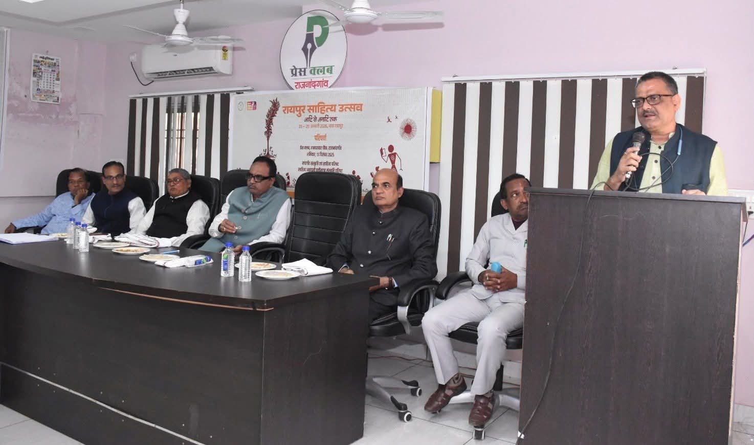 रायपुर साहित्य उत्सव : आदि से अनादि तक का आयोजन 23 जनवरी से 25 जनवरी 2026 तक नवा रायपुर में किया जा रहा है। इसी कड़ी में नांदगांव संस्कृति एवं साहित्य परिषद एवं साहित्य अकादमी छत्तीसगढ़़ संस्कृति परिषद द्वारा आज प्रेस क्लब में परिचर्चा का आयोजन किया गया। इस अवसर पर मुख्य अतिथि के तौर पर वरिष्ठ पत्रकार सुशील कोठारी उपस्थित थे। साहित्य अकादमी के अध्यक्ष शशांक शर्मा ने कार्यक्रम की अध्यक्षता की। इस दौरान विशिष्ट अतिथि के तौर पर पुरातत्वविद डॉ. आरएन विश्वकर्मा, विभागाध्यक्ष हिन्दी डॉ. शंकर मुनि राय एवं अन्य साहित्यकार उपस्थित रहे।