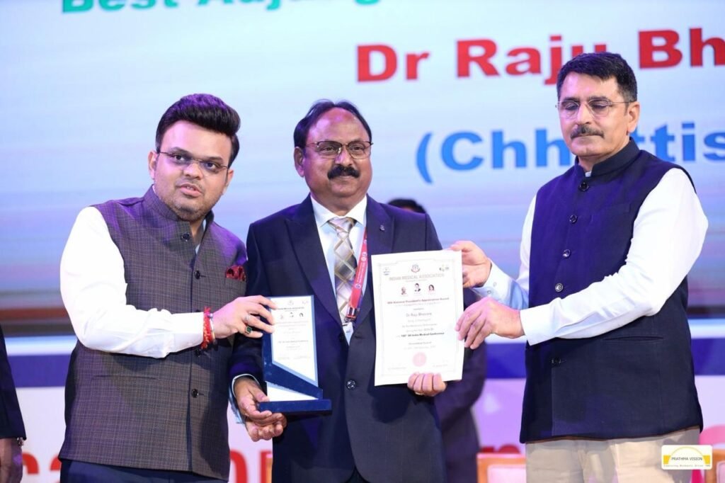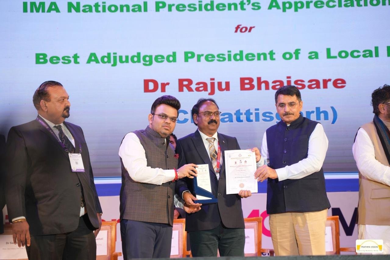 भिलाई। भारतीय चिकित्सकों की सर्वोच्च संस्था इंडियन मेडिकल एसोसिएशन (आईएमए), नई दिल्ली द्वारा आईएमए राष्ट्रीय पुरस्कार घोषित किये गए जिनमें जवाहरलाल नेहरू चिकित्सालय, भिलाई के वरिष्ठ सलाहकार (पैथोलॉजी विभाग) तथा आईएमए दुर्ग शाखा के अध्यक्ष (वर्ष 2024) डॉ. राजू भैंसारे को “बेस्ट ब्रांच प्रेसिडेंट आईएमए नेशनल प्रेसिडेंट अप्रिशिएशन अवार्ड” से सम्मानित किया गया है। यह प्रतिष्ठित राष्ट्रीय पुरस्कार अहमदाबाद (गुजरात) में आयोजित ऑल इंडिया मेडिकल कॉन्फ्रेंस के 100 वर्ष पूर्ण होने के अवसर पर प्रदान किया गया।
