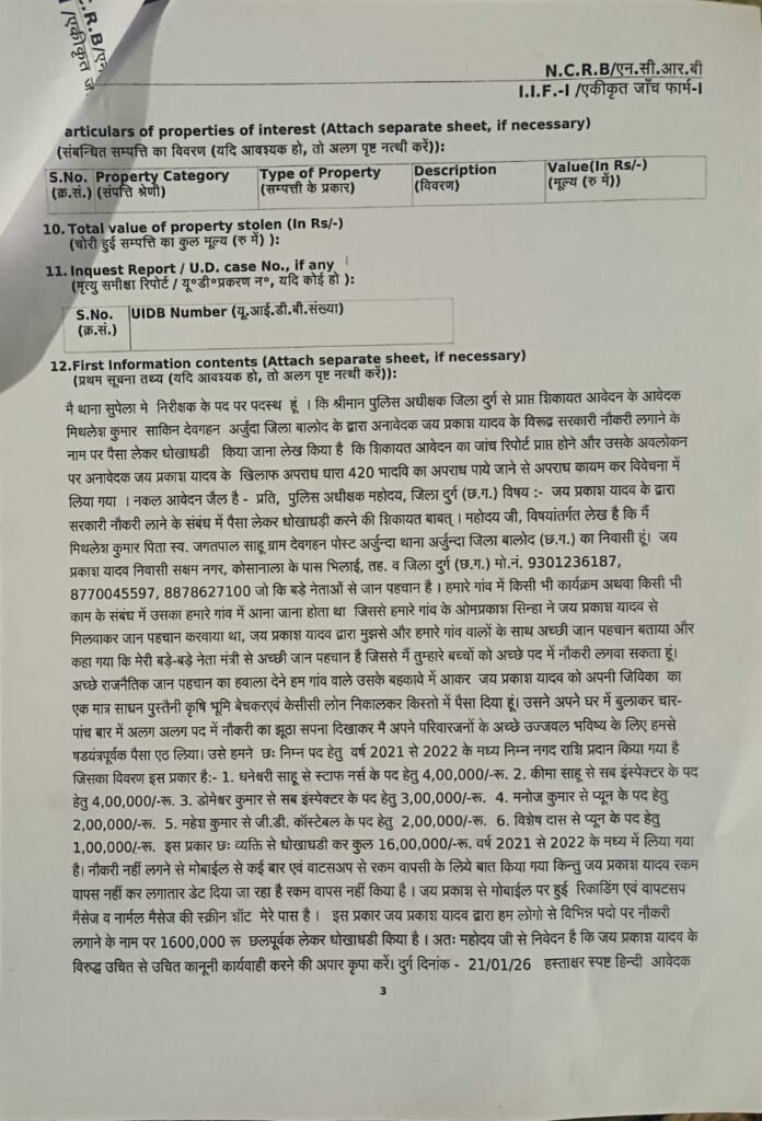 थाना सुपेला निरीक्षक विजय यादव ने बताया कि मिथलेश कुमार निवासी देवगहन अर्जुदा जिला बालोद के द्वारा जय प्रकाश यादव के विरूद्र सरकारी नौकरी लगाने के नाम पर रूपये लेकर धोखाधड़ी की शिकायत के अवलोकन पश्चात जय प्रकाश यादव के खिलाफ 420 भादवि का अपराध पाये जाने से अपराध कायम कर विवेचना में लिया गया है।