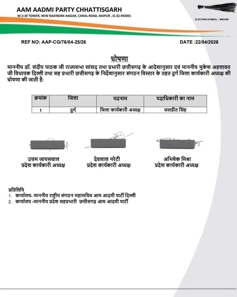 भिलाई/दुर्ग: आम आदमी पार्टी (AAP) छत्तीसगढ़ ने अपने संगठन को मजबूती देने के उद्देश्य से एक महत्वपूर्ण घोषणा की है। पार्टी के राष्ट्रीय संगठन महामंत्री डॉ. संदीप पाठक (राज्यसभा सांसद एवं छत्तीसगढ़ प्रभारी) और मुकेश अहलावत (विधायक दिल्ली एवं छत्तीसगढ़ सह-प्रभारी) के दिशा-निर्देशानुसार दुर्ग जिले में संगठन का विस्तार किया गया है।