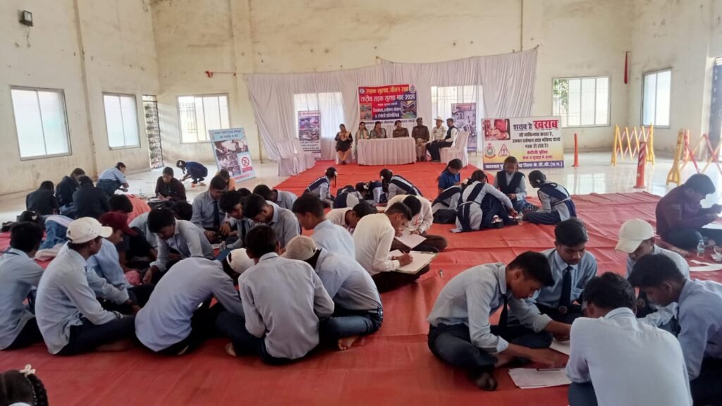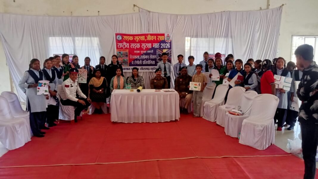 खैरागढ़ : जिला पुलिस केसीजी द्वारा सड़क सुरक्षा माह के दौरान सड़क दुर्घटनाओ के रोकथाम हेतु यातायात जन जागरूकता के तहत सड़को, विभिन्न चौक चौराहो पर जागरूकता का कार्यक्रम करने के साथ ही बुधवार को 21.01. 26 को स्कूली छात्र /छात्राओं का सड़क सुरक्षा विषयान्तर्गत रंगोली,निबंध,चित्रकला प्रतियोगिता का आयोजन कराया गया ।। इस प्रतियोगिता का भव्य आयोजन दिलीप सिंह मंगल भवन खैरागढ़ में किया गया ।। प्रतियोगी छात्र /छात्राओं द्वारा यातायात नियमों के प्रति जागरूकता लाने मनमोहक रंगोली, चित्रकला का आकर्षक प्रदर्शन करते निबंध लेखन किया गया।। इस प्रतियोगिता का उद्देश्य स्कूली बच्चो में यातायात नियमों का पालन करने जागरूक करना है जिसमे प्रतिभागी बच्चों में विजेताओं को निर्णायक समिति के निर्णयानुसार पुरुस्कार वितरण किया जायेगा।।जागरूकता कार्यक्रम में उपस्थित शिक्षको छात्र /छात्राओं की गरिमामयी उपस्थिति पर केसीजी पुलिस धन्यवाद ज्ञापित करत है।।