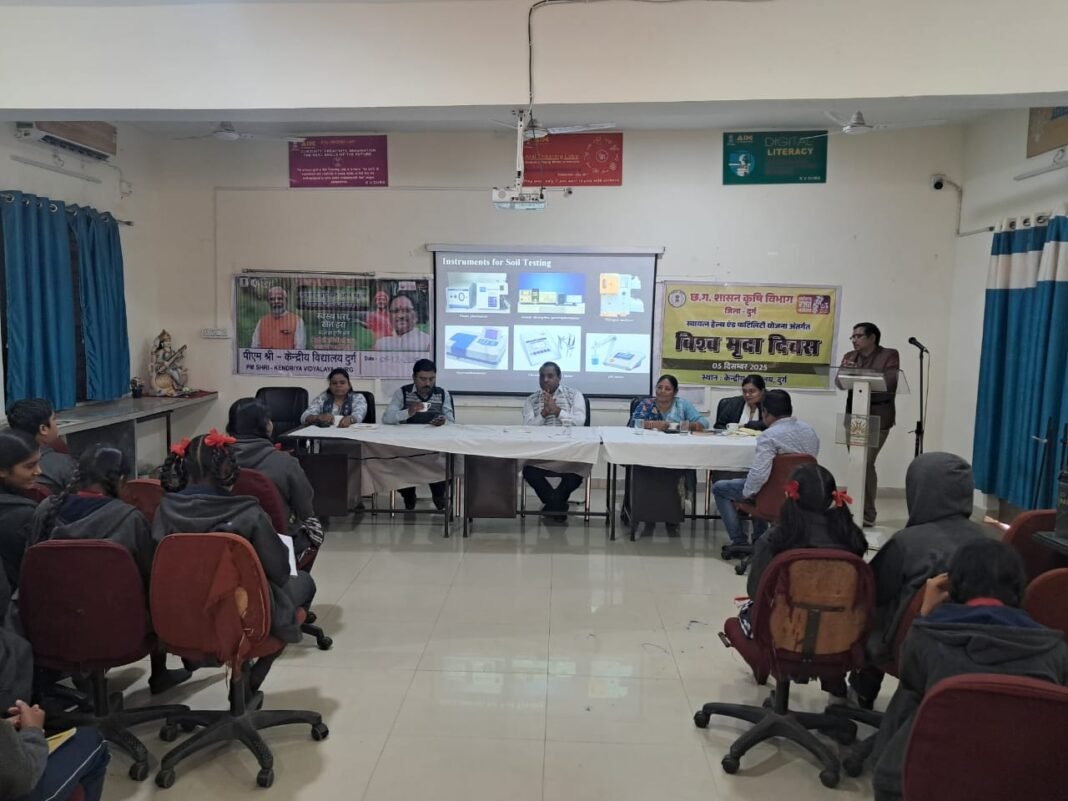 दुर्ग। पीएम श्री केंद्रीय विद्यालय दुर्ग में मृदा दिवस के अवसर पर ‘मिट्टी परीक्षण कार्यशाला एवं विविध कार्यक्रमों’ का प्रभावी आयोजन किया गया। कार्यक्रम की अध्यक्षता प्राचार्य आचार्य उमाशंकर मिश्रा ने की। प्रधानाध्यापक कमल सोनी तथा पूनम मिश्रा द्वारा अतिथियों का पुष्पगुच्छ देकर सम्मानपूर्वक स्वागत किया गया। कार्यक्रम के मुख्य प्रभारी राजेश कुमार रहे तथा संचालन डॉ. अजय आर्य ने किया।