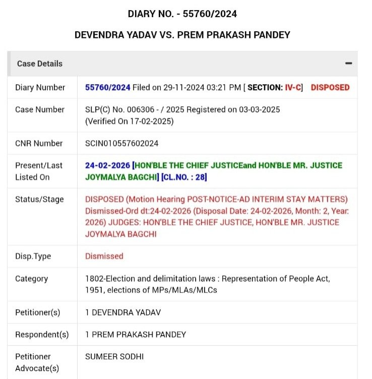 नई दिल्ली। 65-भिलाई नगर विधानसभा निर्वाचन से जुड़े चुनाव याचिका प्रकरण में देवेंद्र यादव को सुप्रीम कोर्ट से बड़ा झटका लगा है। सुप्रीम कोर्ट ने छत्तीसगढ़ उच्च न्यायालय के आदेश के विरुद्ध दायर उनकी विशेष अनुमति याचिका (SLP) को निराधार मानते हुए खारिज कर दिया और उन्हें हाईकोर्ट में चुनाव याचिका का सामना करने का निर्देश दिया।