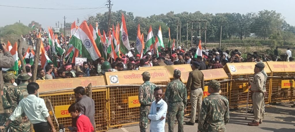 (यतेंद्र जीत सिंह “छोटू”)खैरागढ़ : श्री सीमेंट परियोजना के विरोध में शनिवार को एक बड़ा जन आंदोलन देखने को मिला।।‌ हजारों की संख्या में आक्रोशित प्रदर्शनकारियों ने छुईखदान एसडीएम कार्यालय पहुंचकर प्रस्तावित सण्डी चूना पत्थर खदान और सीमेंट प्लांट के खिलाफ विरोध प्रदर्शन किया।। प्रदर्शन के दौरान पुलिस ने प्रदर्शनकारियों पर लाठी चार्ज की प्रदर्शनकारीयो पर पुलिस ने लाठीचार्ज किया,जिससे स्थिति तनावपूर्ण हो गई।।प्रदर्शनकारियों ने रास्ता रोक रहे कई पुलिस वालों को दौड़ा दिया सैकड़ों गांवों से हजारों की संख्या में महिला, युवा और बुजुर्ग 500 से अधिक ट्रैक्टर–ट्रॉलियों के विशाल काफिले के साथ छुईखदान की ओर कूच किया।। पुलिस ने छुईखदान की सीमा पर किसानों की रैली को रोकने की कोशिश की, लेकिन ग्रामीण टैक्टर से उतरकर पैदल ही आगे बढ़ते हुए एसडीएम कार्यालय पहुंच गए और 11 दिसंबर को प्रस्तावित जनसुनवाई रद्द करने की मांग का ज्ञापन सौंपा।।