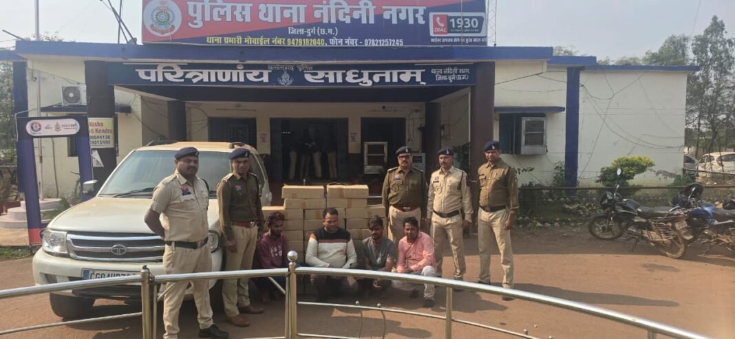 दुर्ग। थाना नंदिनी नगर पुलिस ने अवैध शराब तस्करी पर बड़ी कार्रवाई करते हुए चार आरोपियों को धर दबोचा। पुलिस ने इनके कब्जे से 28 पेटी देसी शराब, मोबाइल फोन, नगदी और तस्करी में प्रयुक्त टाटा सफारी वाहन समेत कुल 4,74,500 रुपये का माल जब्त किया है। कार्रवाई धान 34(2) आबकारी एक्ट के तहत की गई है।