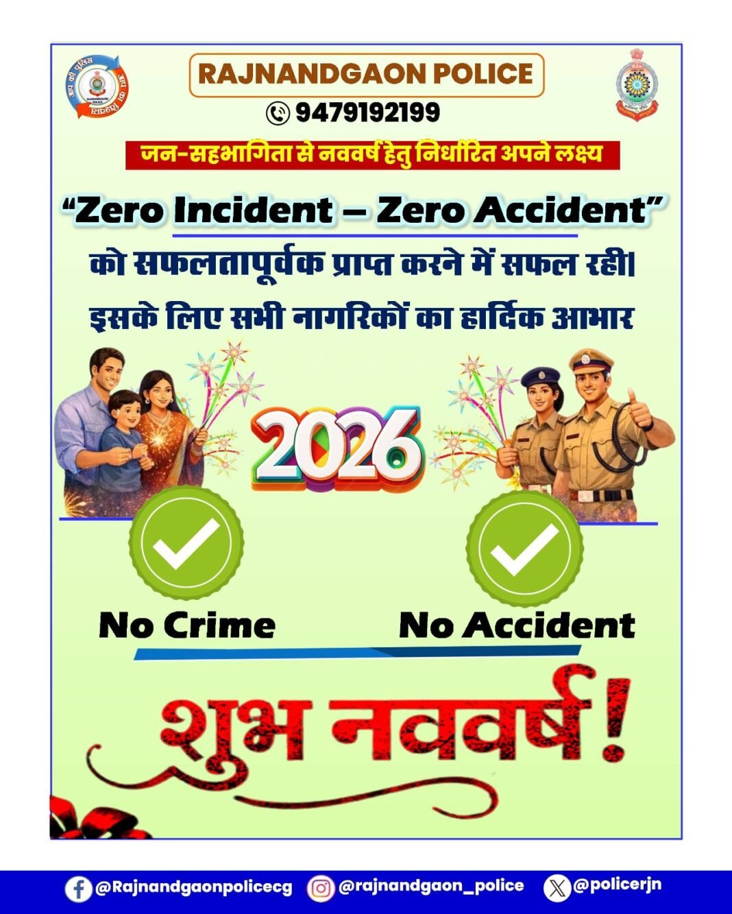 राजनांदगांव। जिले में नववर्ष 2026 का आयोजन पूर्णतः शांतिपूर्ण, सुरक्षित एवं अनुशासित वातावरण में सफलतापूर्वक संपन्न हुआ। राजनांदगांव पुलिस द्वारा नववर्ष के दृष्टिगत की गई व्यापक, सख़्त, सुनियोजित एवं तकनीक आधारित सुरक्षा व्यवस्था के परिणामस्वरूप जिले का “ज़ीरो घटना – ज़ीरो दुर्घटना” का लक्ष्य पूर्णतः प्राप्त हुआ।