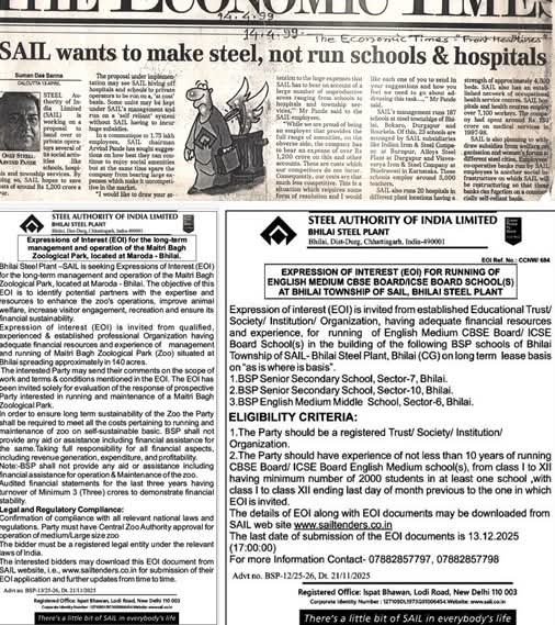 (यहां तस्वीरें इकॉनॉमिक्स टाइम्स में साल 1999 में सेल चेयरमैन अरविंद पांडेय के इंटरव्यू की और आज भिलाई स्कूल व मैत्रीबाग के लिए जारी रूचि की अभिव्यक्ति (EOI) की।
