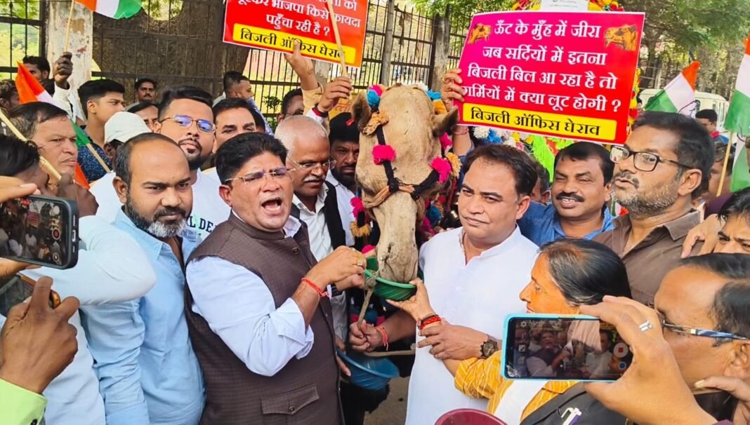 दुर्ग। जिला ग्रामीण कांग्रेस अध्यक्ष राकेश ठाकुर के नेतृत्व में आज जिला मुख्यालय के बिजली ऑफिस और कलेक्ट्रेट के सामने कांग्रेसियों ने ऊंट को जीरा खिलाकर बिजली बिल हॉफ योजना को 200 यूनिट करने का विरोध किया और पूर्व में कांग्रेस की सरकार की तरह 400 यूनिट करने की मांग की गई।