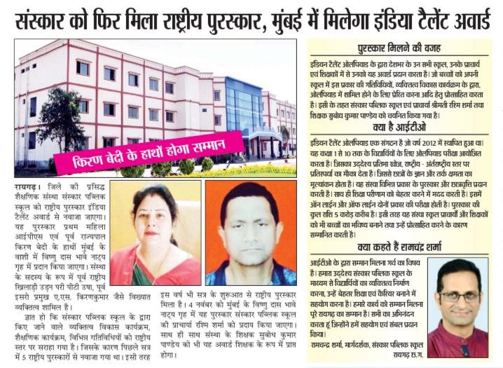 रायगढ़। जिले की प्रसिद्ध शैक्षणिक संस्था संस्कार पब्लिक स्कूल को राष्ट्रीय पुरस्कार इंडिया टैलेंट ओलिंपियाड अवार्ड से नवाजा जाएगा। यह पुरस्कार प्रथम महिला आईपीएस एवं पूर्व राज्यपाल किरण बेदी के हाथों मुंबई के वाशी में विष्णु दास भावे नाट्य गृह में प्रदान किया जाएगा। संस्था के सदस्य के रूप में पूर्व राष्ट्रीय खिलाड़ी उडऩ परी पीटी उषा, पूर्व इसरो प्रमुख ए.एस. किरणकुमार जैसे विख्यात व्यक्तित्व शामिल है।