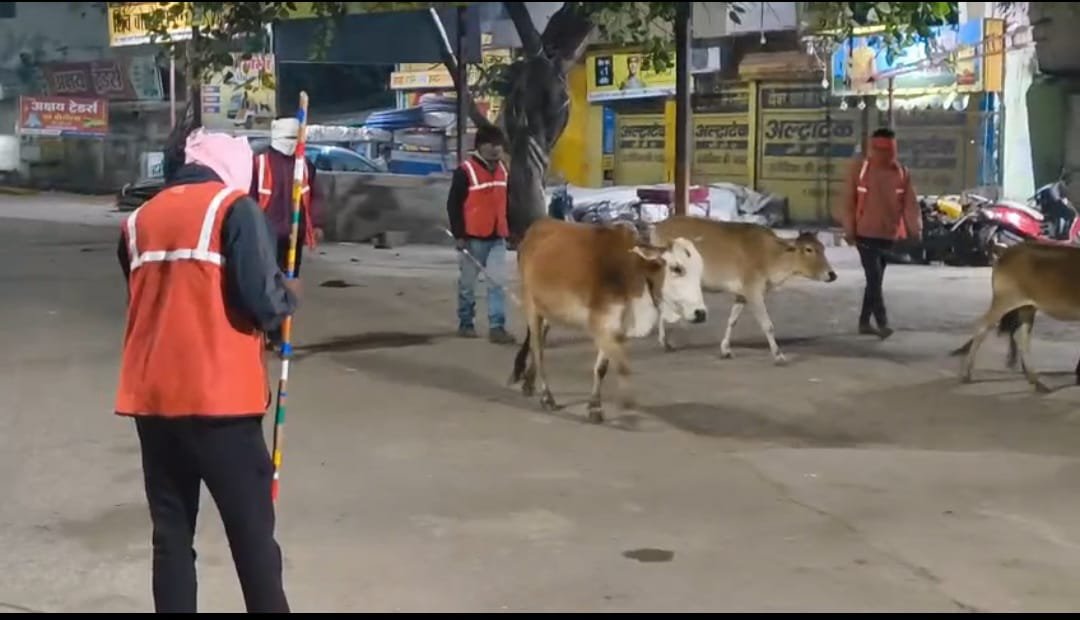 नगर निगम आयुक्त अतुल विश्वकर्मा द्वारा घुमन्तु मवेशियांे को पकड़ने गठित टीम चौक चौराहो से घुमन्तु मवेशियों को पकड़ने की कार्यवाही कर रही है तथा रात्रि में मेन रोड व मुख्य चौक चौराहो मंे बैठे व घुमते मवेशियो को हकालने का काम कर रही है। आज की कार्यवाही में सन सिटी एवं कंचन बाग क्षेत्र से 7 घुमन्तु एवं बैठे मवेशियों को पकड़ा गया। मवेशियों को पकड़कर कांजी हाउस में रखा जाता है, जहॉ उन्हे पैरा कुट्टी के साथ साथ बसंतपुर गंज मण्डी सें बचे फल सब्जी प्रतिदिन लाकर खिलाया जा रहा है, ताकि उन्हे पौष्टिक आहार मिलता रहे, बीमार मवेशियो को गौशाला पिंजरापोल लेजाकर ईलाज भी कराय जाता है। साथ ही उन्हंे छोडने पर 570-570 रूपये संबंधित से अर्थदण्ड लेकर मवेशी छोडा जाता है। गत दिवस कल तुलसीपुर व चिखली से 6 मवेशी पकडे गये थे।