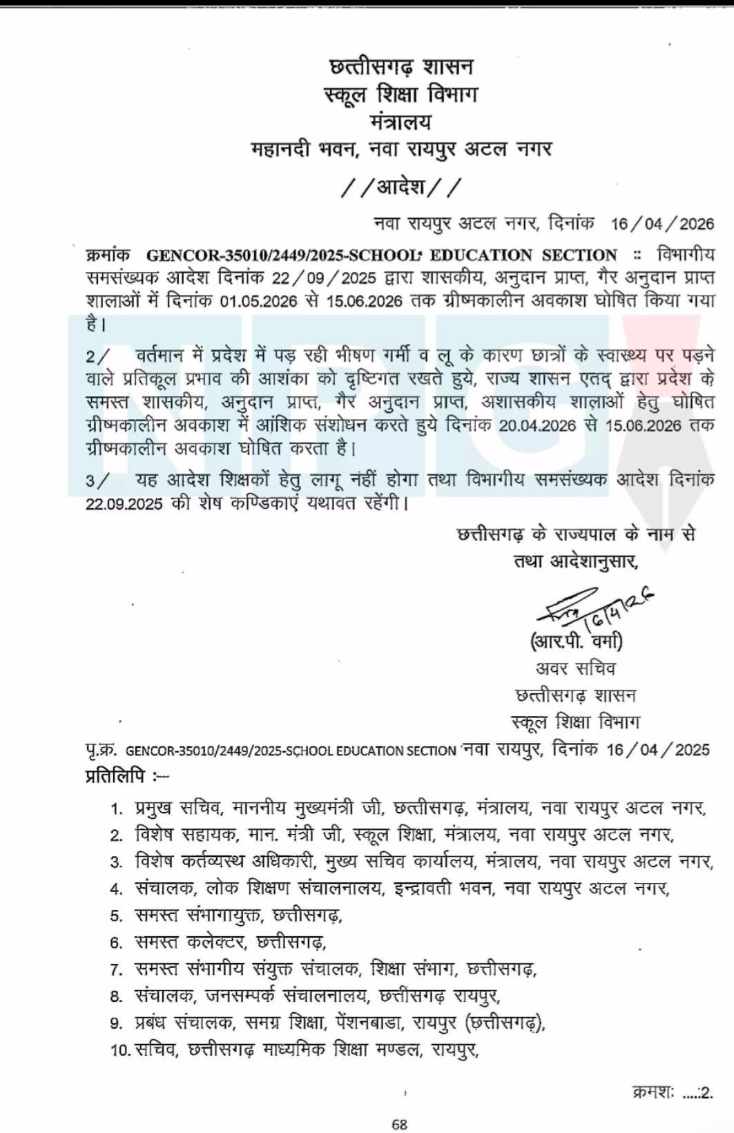स्कूल शिक्षा विभाग मंत्रालय, महानदी भवन, नवा रायपुर अटल नगर द्वारा जारी आदेश के अनुसार, पूर्व में दिनांक 01 मई 2026 से 15 जून 2026 तक घोषित ग्रीष्मकालीन अवकाश में संशोधन करते हुए अब दिनांक 20 अप्रैल 2026 से 15 जून 2026 तक अवकाश घोषित किया गया है। यह आदेश प्रदेश के समस्त शासकीय, अनुदान प्राप्त, गैर अनुदान प्राप्त एवं अशासकीय शालाओं पर लागू होगा।