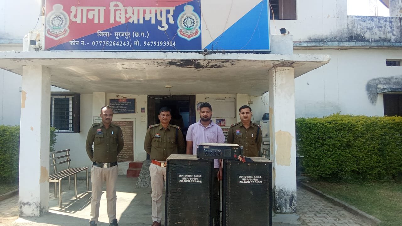 दिनांक 15-16 नवम्बर 2025 की दरम्यिानी रात्रि में थाना विश्रामपुर पुलिस रात्रि गश्त पर थी इसी बीच सूचना मिली कि ग्राम तलवापारा में तेज ध्वनि से साउण्ड बाक्स बजाया जा रहा है जिससे आमजनों को काफी परेशानी हो रही है। सूचना मिलते ही मौके पर पहुंची पुलिस ने बिना अनुमति के तेज आवाज से साउण्ड बाक्स बजाते पाए जाने पर 2 नग साउण्ड बाक्स व 1 नग एम्पलीफायर जप्त कर गुड्डू खुलेखीन देवांगन उम्र 46 वर्ष निवासी तलवापारा तथा साउण्ड सिस्टम संचालक विशाल गुप्ता उम्र 22 वर्ष निवासी शिवनंदनपुर थाना विश्रामपुर के विरूद्ध धारा 4, 5, 15(1) कोलाहल अधिनियम के तहत कार्यवाही किया है।