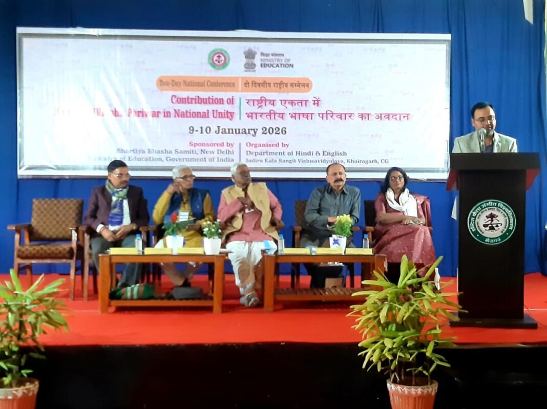 खैरागढ़ : इंदिरा कला संगीत विश्वविद्यालय, खैरागढ़ में आयोजित दो दिवसीय राष्ट्रीय सम्मेलन का समापन शनिवार 10 जनवरी को हुआ।। समापन समारोह के मुख्य अतिथि प्रख्यात लेखक प्रो. (डॉ.) श्रीराम परिहार (खंडवा, मध्यप्रदेश) रहे।। कार्यक्रम की अध्यक्षता कला संकाय के अधिष्ठाता प्रो. राजन यादव ने की।। विशिष्ट अतिथि के रूप में प्रो. (डॉ.) शिवप्रसाद शुक्ला, इलाहाबाद विश्वविद्यालय, प्रयागराज एवं कार्यक्रम के संयोजक डॉ. कौस्तुभ रंजन सहा.प्राध्यापक अंग्रेजी विभाग उपस्थित रहे।। सम्मेलन में देश के विभिन्न हिस्सों से आए विद्वानों ने सहभागिता की।। प्रमुख वक्ताओं में प्रो. (डॉ.) वरप्रसाद कोल्ला (रायपुर), डॉ. उमाशंकर पांडे (दिल्ली), प्रो. (डॉ.) सावित्री त्रिपाठी (बेल्हा), प्रो. (डॉ.) आर. सुब्रमणि (बिलासपुर), प्रो. (डॉ.) रमेश सिंह (प्रयागराज), प्रो. (डॉ.) आर. ए. चौधरी, प्रो. (डॉ.) यू. के. मिश्रा (बिलाईगढ़) एवं प्रो. (डॉ.) के. अजीता (कोच्चि) शामिल रहे।।