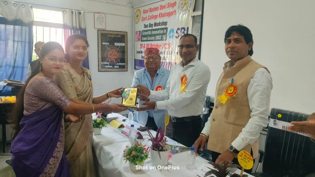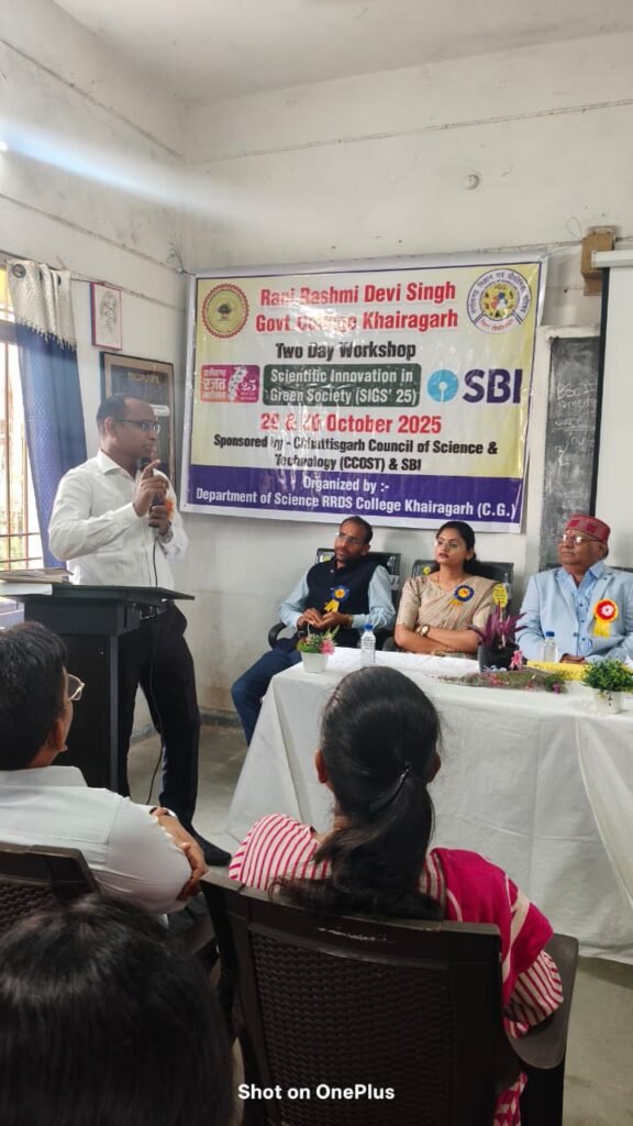 खैरागढ़ : रानी रश्मि देवी सिंह शासकीय महाविद्यालय खैरागढ़ में प्राचार्य डॉ. ओ. पी. गुप्ता के मार्गदर्शन में विज्ञान संकाय और आईक्यूएसी के संयुक्त तत्वावधान में ‘साइंटिफिक इनोवेशन इन ग्रीन सोसाइटी’ विषय पर दो दिवसीय कार्यशाला 29 एवं 30 अक्टूबर का आयोजित हुआ।।29 अक्टूबर 2025 को इस आयोजन के उद्घाटन सत्र में मुख्य अतिथि प्रेमकुमार पटेल, सीईओ जिला पंचायत केसीजी, अध्यक्षता प्रभारी प्राचार्य जितेन्द्र कुमार साखरे,मुख्य वक्ता डॉ. दीप्ति चौहान, स. प्रा. वनस्पतिशास्त्र भिलाई महिला महाविद्यालय भिलाई, विशिष्ट अतिथि जे. के. वैष्णव पूर्व छात्रसंघ प्रभारी उपस्थित रहें।। कार्यशाला के मुख्य अतिथि प्रेम कुमार पटेल ने प्रकृति और पर्यावरण संरक्षण की दिशा में महाविद्यालयीन छात्र-छात्राओं की भूमिका पर प्रकाश डालते हुए वृक्षारोपण, प्लास्टिक निषेध, सौर ऊर्जा, पवन ऊर्जा, अपशिष्ट प्रबंधन जैसे महत्वपूर्ण गतिविधियों से परिचय कराया।।