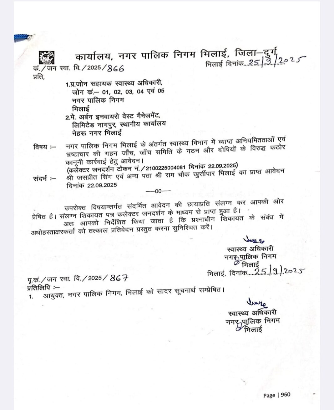 शिकायत की गंभीरता को देखते हुए, स्वास्थ्य अधिकारी, नगर पालिक निगम भिलाई द्वारा दिनांक 25.09.2025 को एक आधिकारिक पत्र (क्र. /जन स्वा. वि./2025/866) जारी किया गया है।