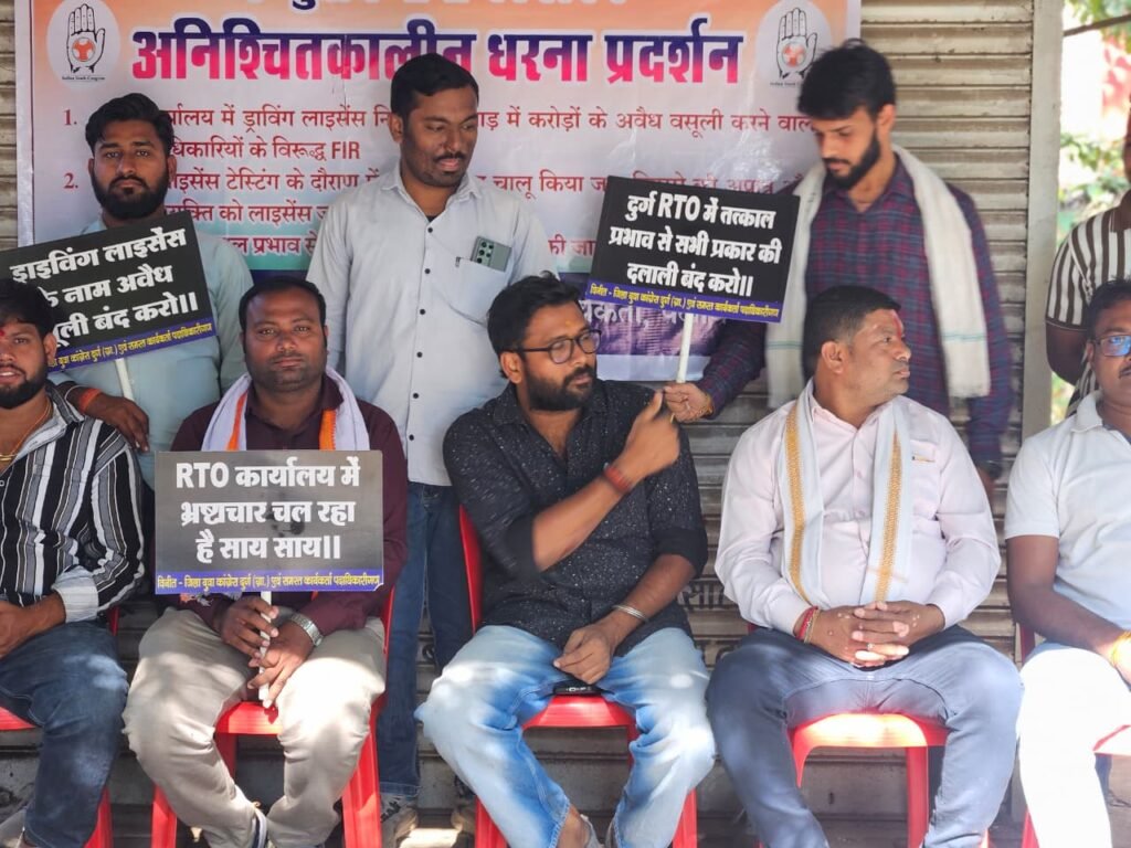 किन्तु आज दिनाँक तक कोई कार्यवाही नही किये जाने से पुनः दलाली की व्यवस्था व रिश्वतखोरी RTO कार्यालय में अरंभ हो जाने के कारण दिनाँक 6 नवंबर दिन गुरुवार से जिला युवा कांग्रेस दुर्ग(ग्रा) महासचिव दीपांकर साहू के नेतृत्व में 3 सुत्रीय मांगो को लेकर अनिश्चितता कालीन धरना जिसका आज चोथा दिन था महासचिव दीपांकर साहू ने कहा ड्राइविंग लाइसेंस के आड़ में करोड़ों के अवैध वसूली करने वाले प्रमुख अधिकारियों के विरुद्ध जब तक FIR नहीं होता एवं मांग पूरा नहीं होगा तब तक अनिश्चितकालीन आंदोलन अनवरत जारी रहेंगे चाहे 100 दिन लग जाये 1 साल लग जाये जिसमें समय समय में RTO कार्यकाल तक रैली प्रदर्शन हस्ताक्षर अभियान पोस्टकार्ड अभियान व पर्चा बांटने का कार्यक्रम प्रतिदिन के हिसाब से चालू रहेंगे!!